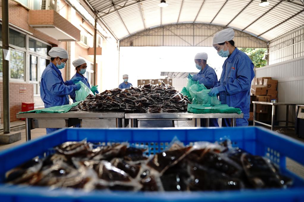 2022年5月1日,上海虹橋中藥飲片有限公司工人對中藥防疫湯劑進行包裝。新華社記者 張建松 攝