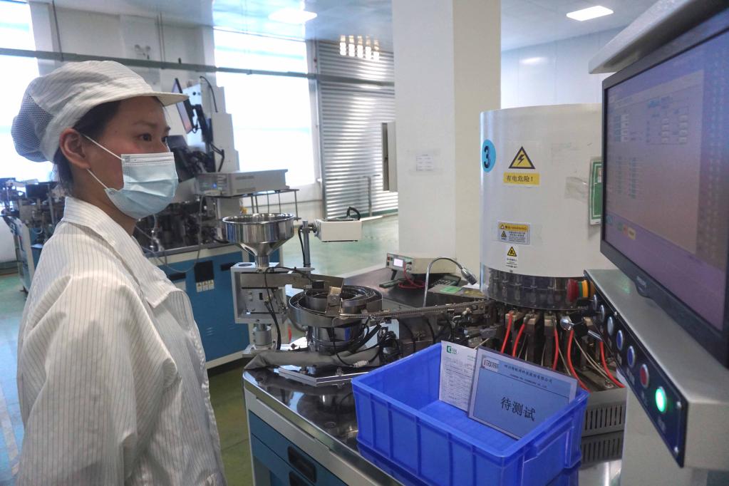 消毒、掃健康碼、出示行程碼后,記者走進四川特銳祥科技股份有限公司生產線,每一個崗位都有工人戴著口罩在堅持生產。生產制造中心總監鄧良澤正在安排5條新生產線的設備安裝。擴產的原因是供不應求,鄧良澤告訴記者:“原有5條生產線7億只電容器產能,去年實現滿產滿銷。”