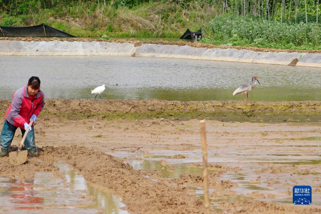稻花香里說豐年,聽取蛙聲一片。在洋縣龍亭村,水田中,密密挨挨的牛蛙,靜待夏日放歌。61歲的龍亭村村民王金枝,在稻蛙共生示范基地里翻耕水田。兩只朱鹮輕輕落在身后覓食,隨著王金枝的走動來回踱步,時遠(yuǎn)時近,形成了一幅人鳥和諧共處的躬耕圖。