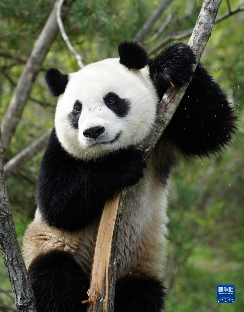 大熊貓“善仔”在陜西洋縣華陽鎮(zhèn)“秦嶺四寶園”熊貓谷爬樹(4月18日攝)。新華社記者 邵瑞 攝