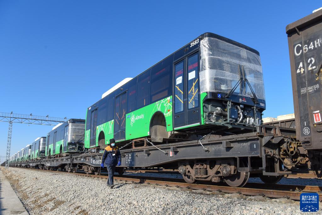 在新疆霍爾果斯鐵路口岸,調(diào)車人員在檢查中歐班列,列車上裝載著出口國外的公交車(2021年2月6日攝)。新華社記者 丁磊 攝