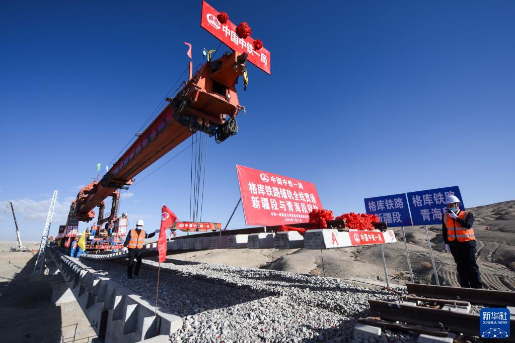 中鐵一局的施工人員在格庫鐵路新疆段鋪設(shè)最后一組軌排(2020年7月21日攝)。新華社記者 丁磊 攝