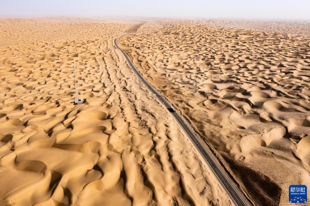 這是2021年10月28日拍攝的穿越塔克拉瑪干沙漠的輪臺(tái)至民豐公路(無人機(jī)照片)。新華社發(fā)(文興華 攝)