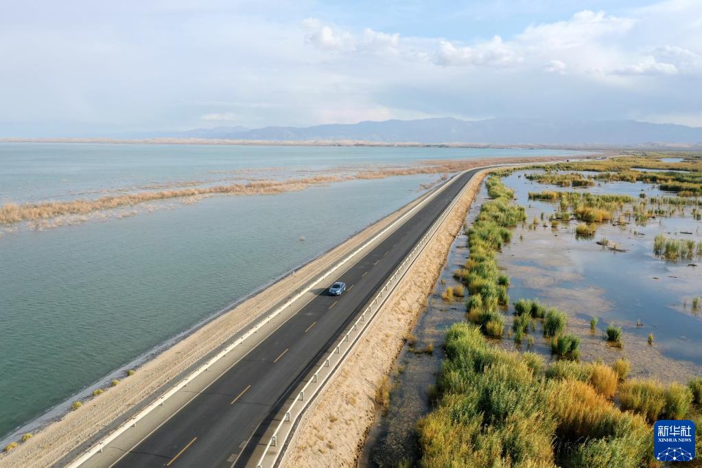 車輛行駛在新疆博斯騰湖河堤公路上(2019年10月12日攝,無人機(jī)照片)。新華社記者 丁磊 攝