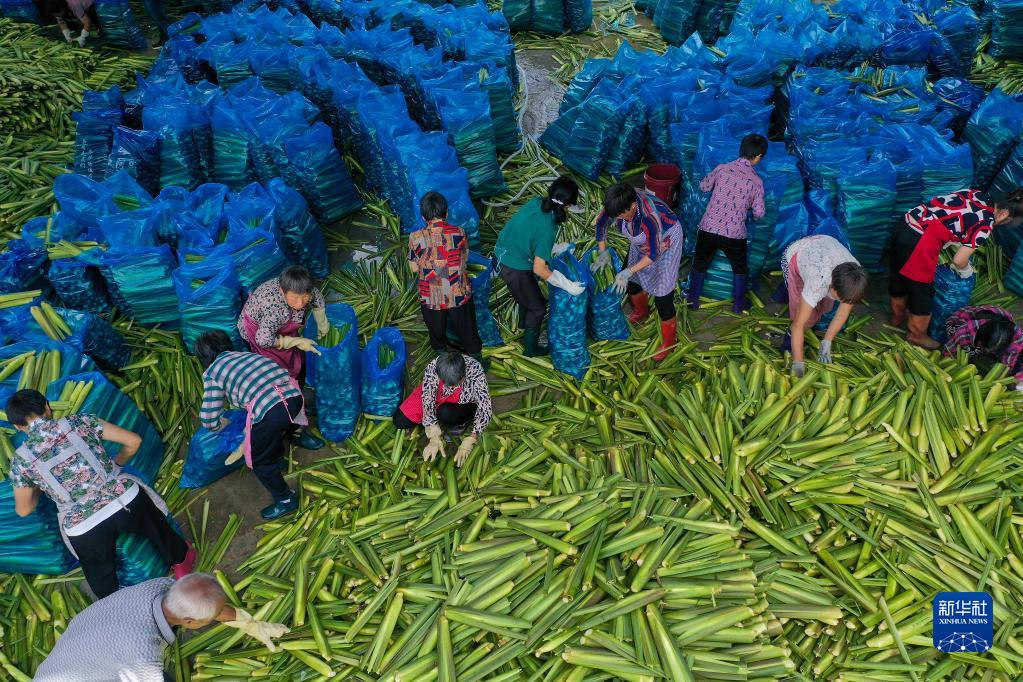 2021年8月25日,在浙江省麗水市景寧畬族自治縣大漈鄉(xiāng)大漈村茭白交易市場,村民將新收割的茭白打包冷藏(無人機照片)。新華社發(fā)(李肅人 攝)