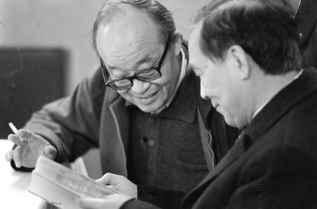這是喬羽(左)在閱讀演唱會上的歌詞。新華社記者 楊飛 攝(1989年1月20日發)