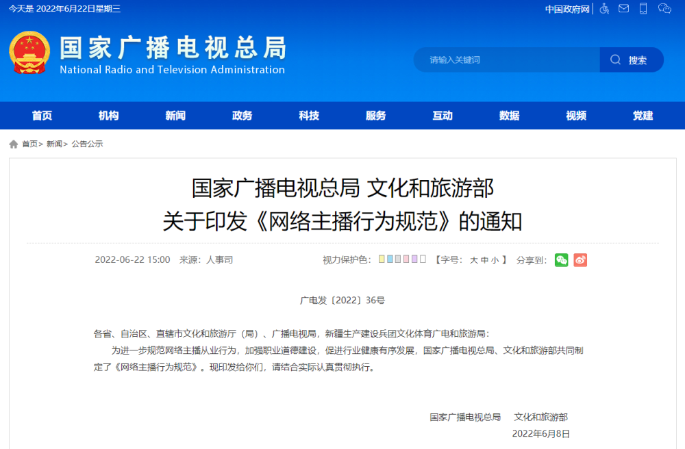 為進一步規范網絡主播從業行為,加強職業道德建設,促進行業健康有序發展,國家廣播電視總局、文化和旅游部共同制定了《網絡主播行為規范》?,F印發給你們,請結合實際認真貫徹執行。