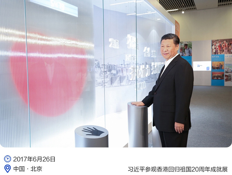 2017年6月26日,習近平主席在國家博物館參觀香港回歸祖國20周年成就展,在展廳按下了“同心圓”互動裝置觸摸板,一顆澎湃的紅心閃現在面前的電子大屏幕上。