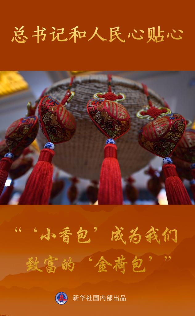 總書記看到我們手工制作的特色香包,連連稱贊“真不錯”“很精致”。我告訴總書記自己制作的中藥香包很好賣,每年凈收入20多萬元。總書記手拿香包,夸獎我手藝好,還自己花錢買下一個,笑著說“我也要捧捧場”。