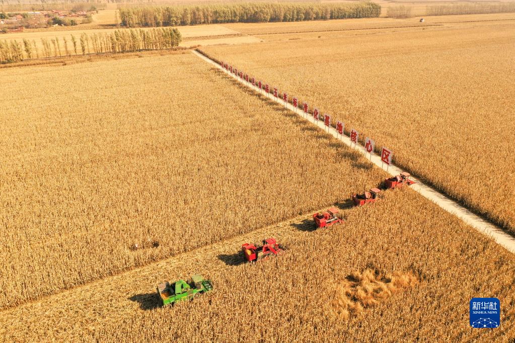在吉林省梨樹縣國家百萬畝綠色食品原料(玉米)標準化生產基地核心示范區,農民駕駛農機進行秋收作業(無人機照片,2021年10月23日攝)。新華社記者 張楠 攝