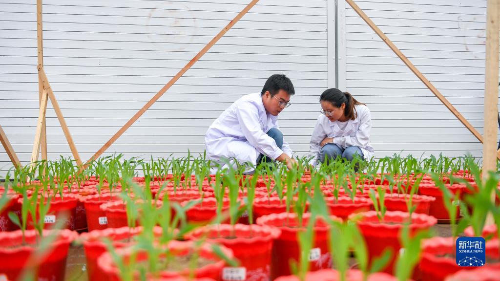 在吉林省梨樹縣四棵樹鄉三棵樹村“科技小院”,中國農業大學學生沙野(左)和郭雯清觀察玉米樣本(2021年8月2日攝)。新華社記者 張楠 攝