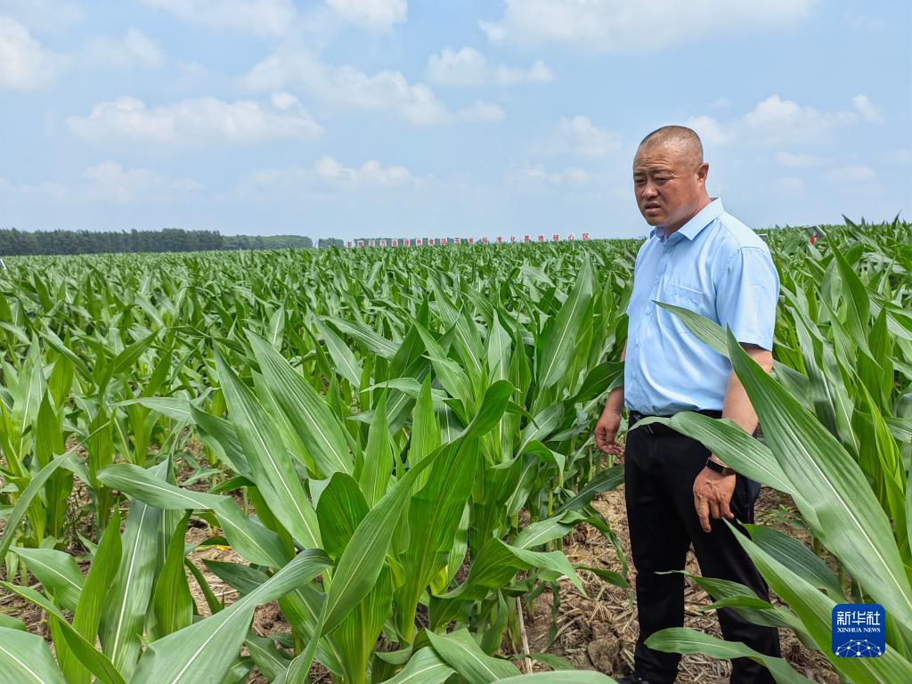 在吉林省梨樹縣泉眼溝村,宏旺農機農民專業合作社理事長張文鏑在田里查看不同種植方式的作物長勢(2022年7月5日攝)。新華社記者 薛欽峰 攝