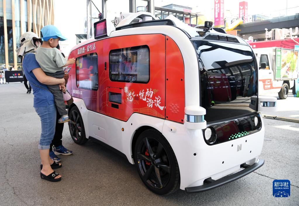 在“北京消費季·悅動海淀”活動現場,市民通過城市綜合服務無人車購買飲品(2020年6月6日攝)。新華社記者 任超 攝