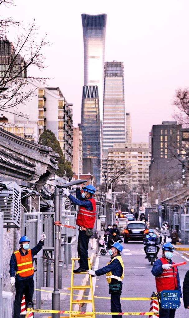北京市城市照明管理中心的技術人員在檢測小街巷中的路燈(2021年12月31日攝)。新華社記者 李欣 攝