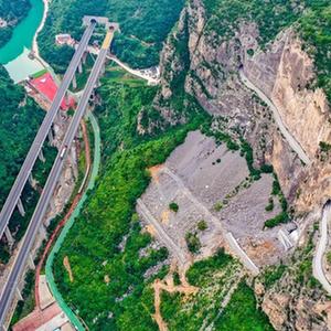 這是通過山西省長治市平順縣虹梯關鄉的高速公路(畫面左側),一旁是過去的“掛壁公路”(畫面右側)(2022年7月5日攝,無人機照片)。新華社記者 曹陽 攝