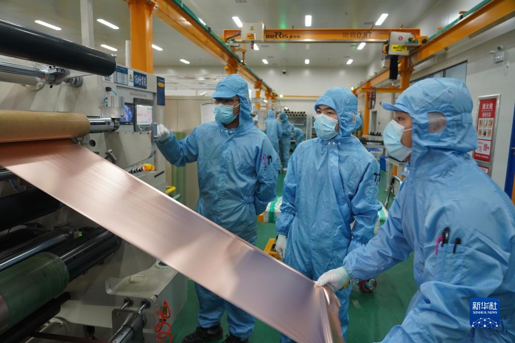 在位于江西南昌高新區的江銅耶茲銅箔有限公司,工人進行鋰電銅箔分切工序(2022年5月12日攝)。新華社記者 周密 攝