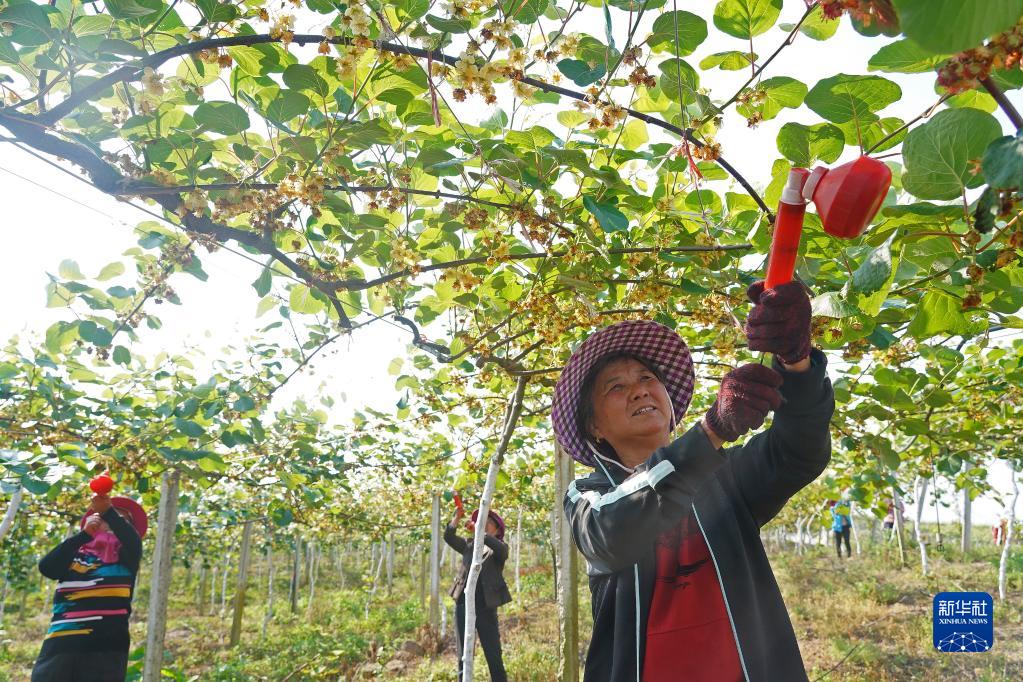 在位于江西宜春市奉新縣赤岸鎮城下村的“初心園”獼猴桃產業扶貧基地,村民為獼猴桃果樹進行人工授粉(2020年4月29日攝)。新華社記者 萬象 攝