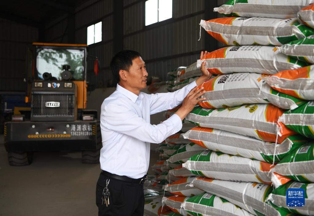 在河南省南陽市唐河縣湖陽鎮張灣村,種糧大戶趙建成在整理倉庫里的化肥,準備夏收之后的夏種(2022年5月26日攝)。新華社記者 張浩然 攝