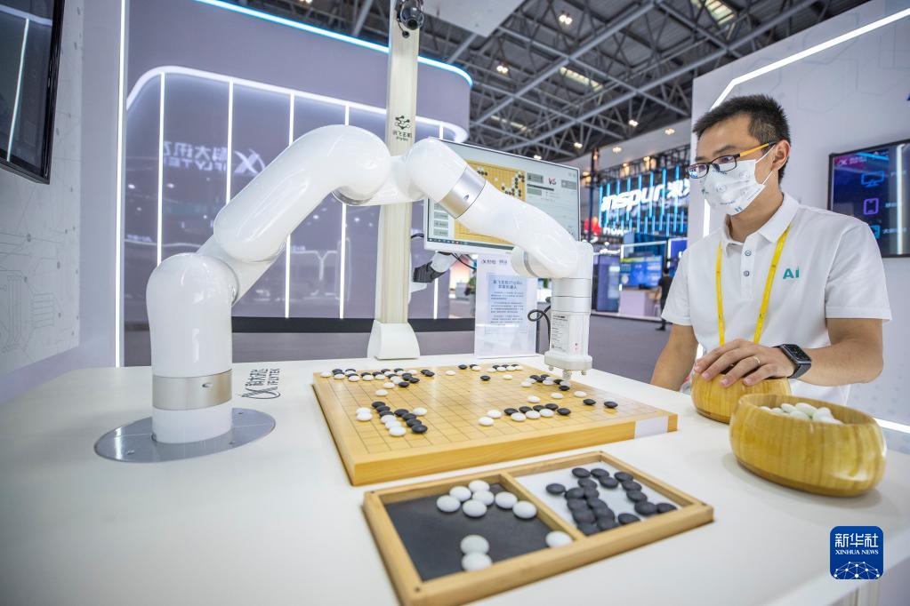 8月21日,2022智博會科大訊飛展廳的工作人員演示與弈棋機器人對弈。新華社記者 黃偉 攝