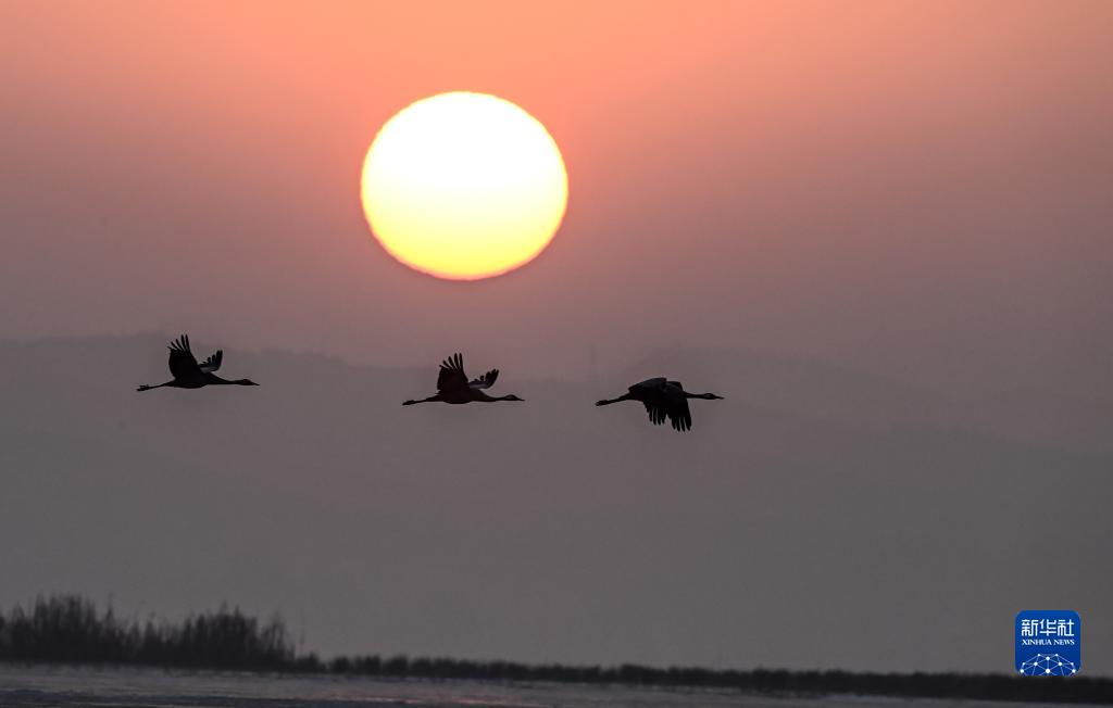 在貴州草海國(guó)家級(jí)自然保護(hù)區(qū)迎著朝陽(yáng)起飛的黑頸鶴(2021年1月13日攝)。新華社記者 楊文斌 攝