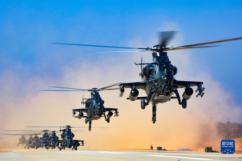陸軍第73集團軍某陸航旅組織飛行訓練,戰機編隊依次起飛(2021年4月22日攝)。新華社發(李士龍 攝)