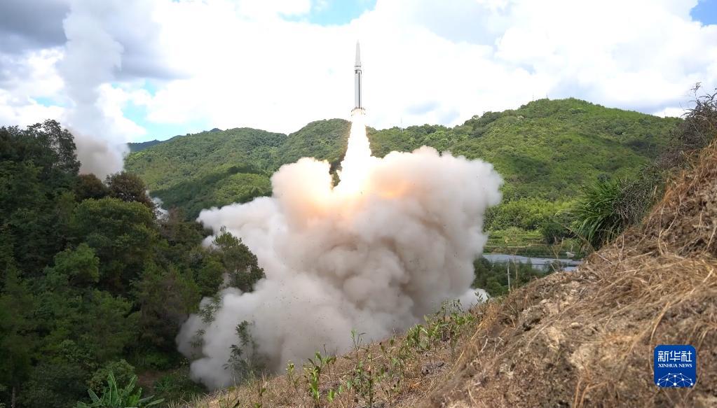 東部戰區火箭軍對臺島東部外海預定海域實施火力突擊。這是導彈發射升空(2022年8月4日,視頻截圖)。新華社發