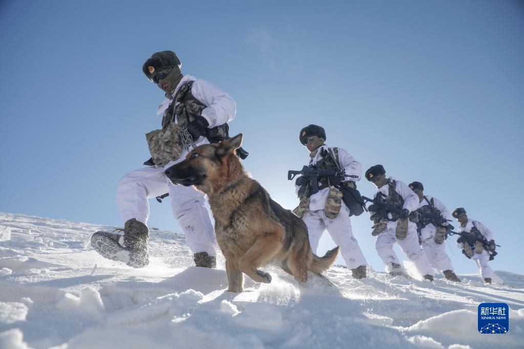 駐守帕米爾高原的新疆喀什軍分區某邊防團托克滿蘇邊防連官兵按計劃對海拔5100米的山口實施例行巡邏(2021年2月11日攝)。新華社發(姬文志 攝)