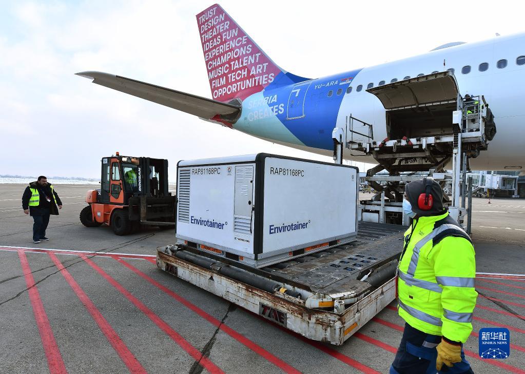 2021年1月16日,在塞爾維亞首都貝爾格萊德,機場工作人員卸載由中國國藥集團生產的新冠疫苗。新華社發(普雷德拉格·米洛薩夫列維奇攝)