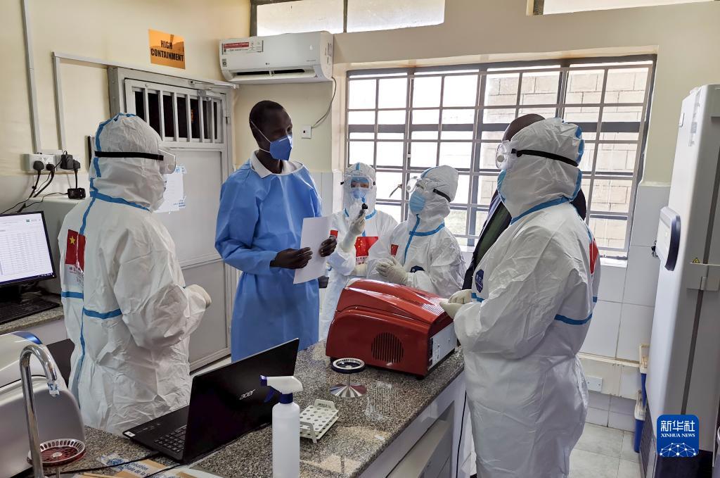 2020年8月21日,在南蘇丹首都朱巴的一處新冠病毒檢測機構,中國抗疫醫療專家組成員與當地醫護人員交流。新華社發(中國駐南蘇丹大使館供圖)