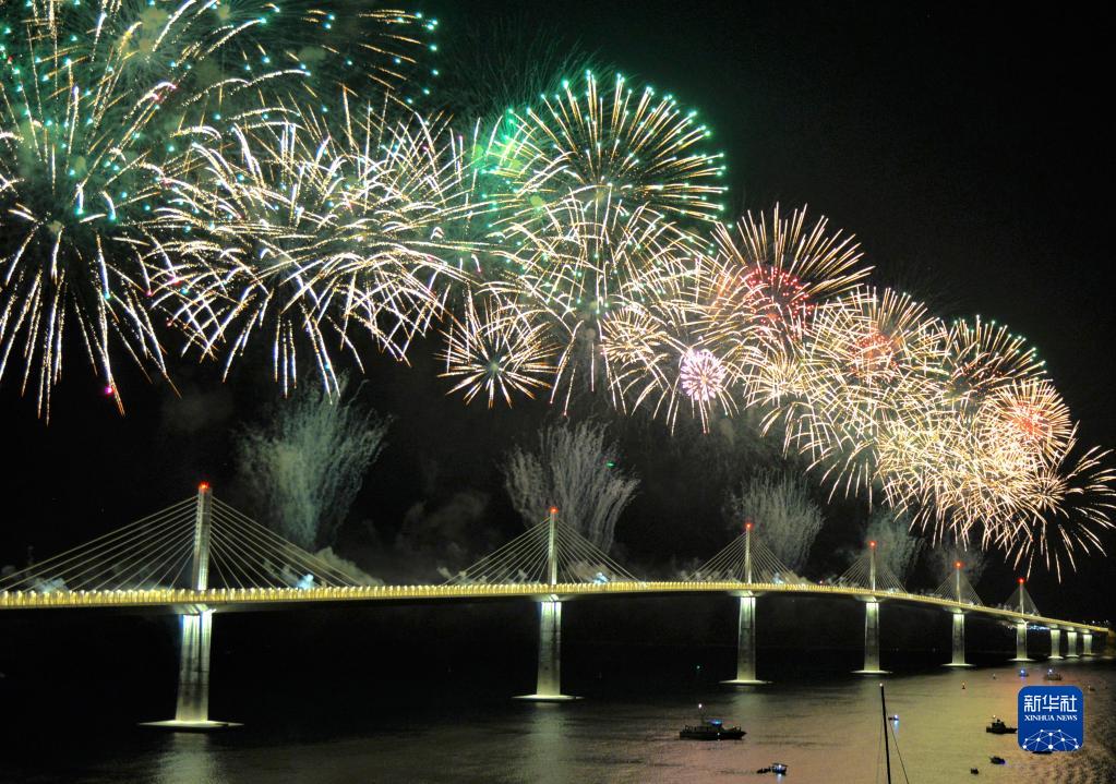 這是2022年7月26日在克羅地亞科馬爾納拍攝的由中企承建的佩列沙茨大橋通車儀式上的焰火表演。新華社記者 李學軍 攝