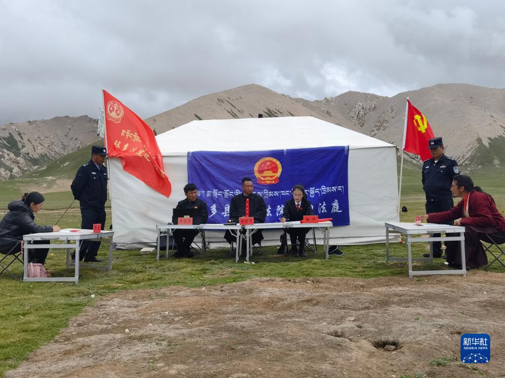 2022年7月14日,在瑪多縣花石峽鎮,瑪多縣人民法院法官在審理案件。新華社發