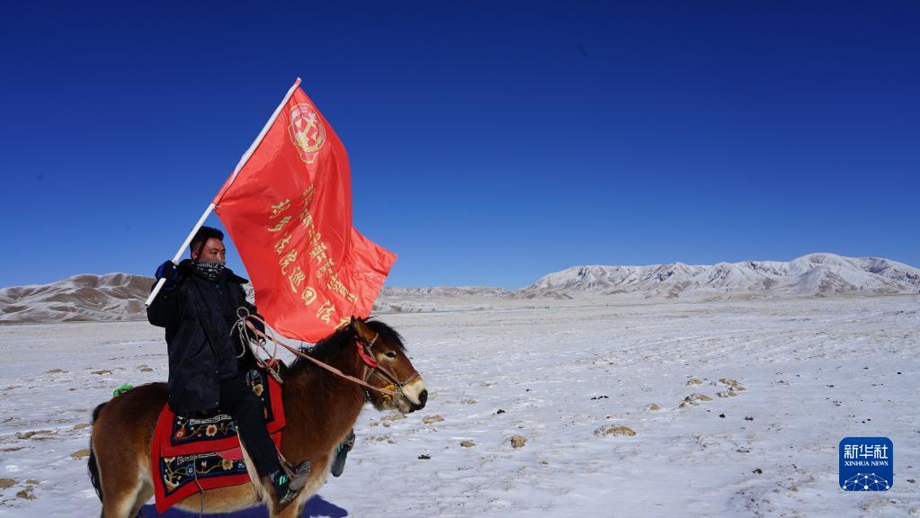 2021年12月20日,瑪多縣人民法院院長錢快乾騎著馬,擎著“瑪多法院巡回法庭”的旗子,下鄉進行普法宣傳。新華社發