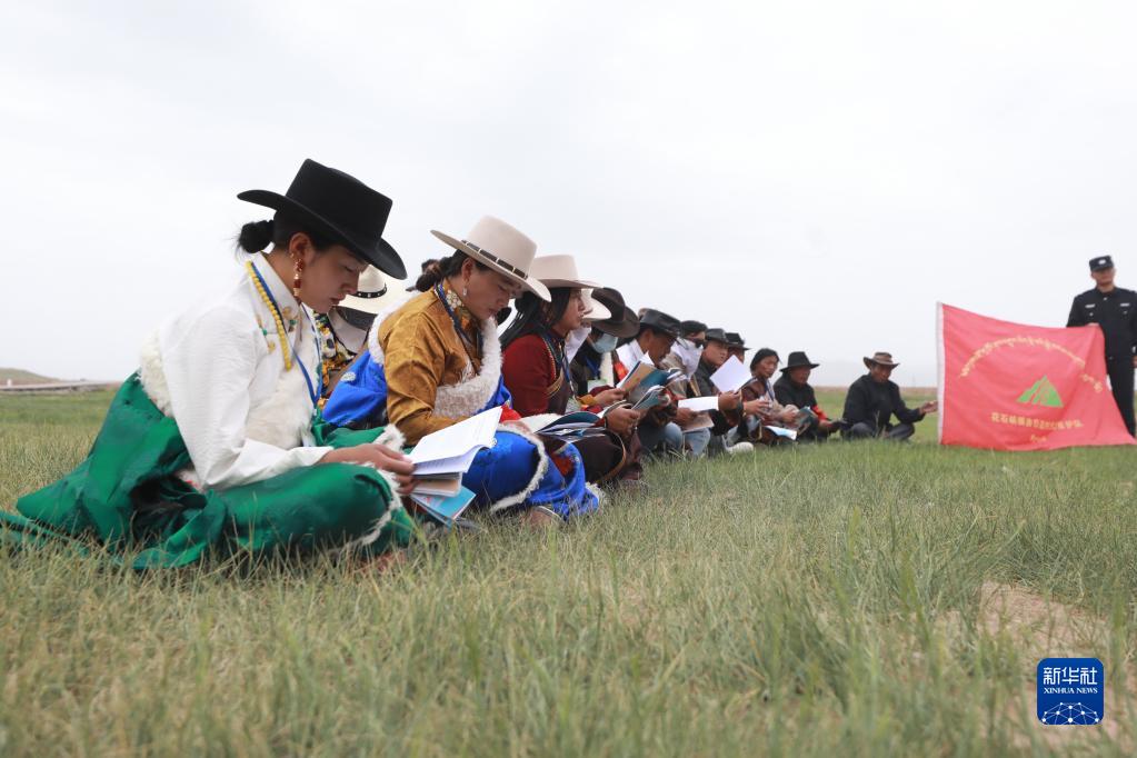 2022年7月12日,在瑪多縣花石峽鎮吉日邁村,瑪多縣人民法院立案庭庭長才偵措(中)在開展環境保護相關法律宣傳。新華社發