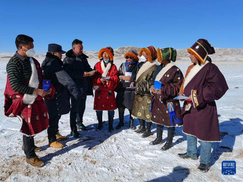 2021年12月20日,瑪多縣人民法院院長錢快乾(左一)給當地牧區群眾宣講法律知識。新華社發