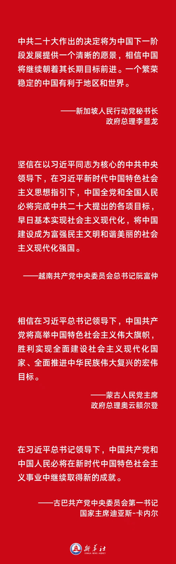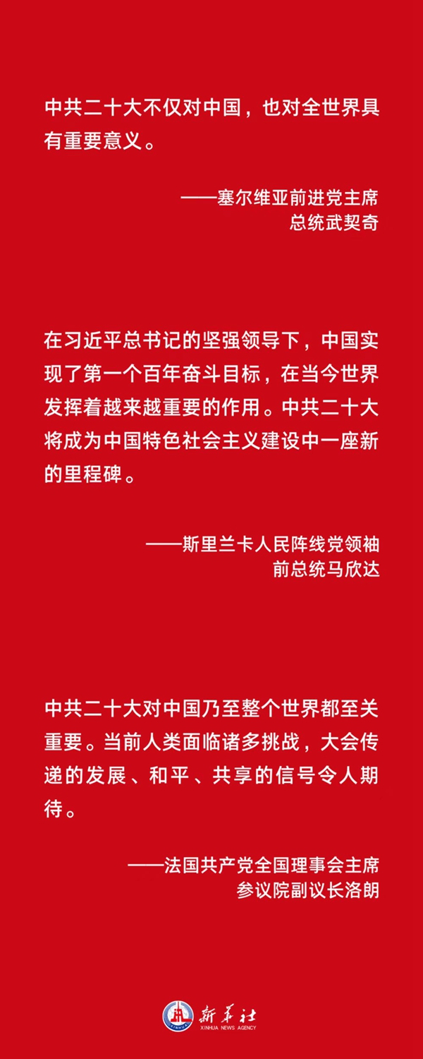 中共二十大,是在全黨全國各族人民邁上全面建設(shè)社會主義現(xiàn)代化國家新征程、向第二個(gè)百年奮斗目標(biāo)進(jìn)軍的關(guān)鍵時(shí)刻召開的一次十分重要的大會。各國政黨政要在賀電賀函中認(rèn)為,當(dāng)今世界充滿不確定性,中共二十大的勝利召開具有里程碑意義,必將對中國和世界產(chǎn)生深遠(yuǎn)影響。