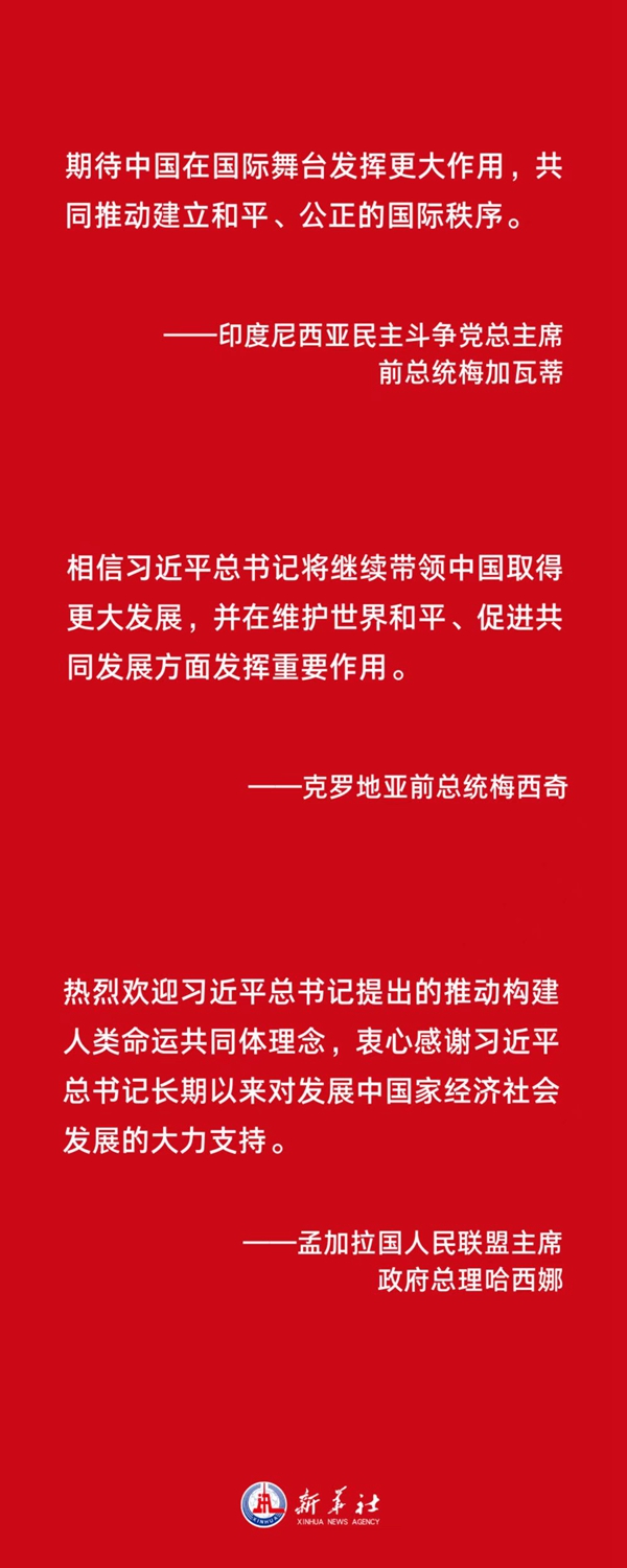 這是黨心所向、民心所盼、眾望所歸,是歷史的選擇,人民的選擇,時(shí)代的選擇。各國政黨政要感佩于這份源自中共全黨和中國人民衷心擁戴的崇高威望,通過賀電賀函表達(dá)他們對習(xí)近平總書記再次全票當(dāng)選的祝賀與敬佩之情。