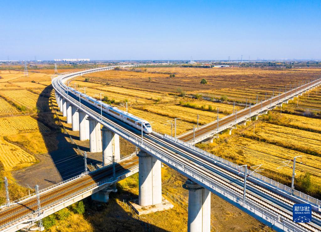 這是在天津北辰區拍攝的動車組列車行駛在京濱城際鐵路寶坻至北辰段(2022年11月4日攝,無人機照片)。新華社發(李佳駿 攝)