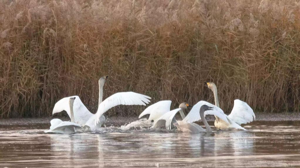 國家二級保護動物小天鵝在湖泊濕地的蘆葦叢中休憩。(銀川市濕地保護中心供圖)