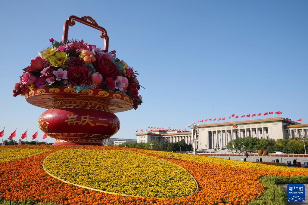 這是2022年10月16日在天安門廣場拍攝的“祝福祖國”巨型花果籃。中國共產黨第二十次全國代表大會于10月16日至22日在北京舉行。新華社記者 王毓國 攝
