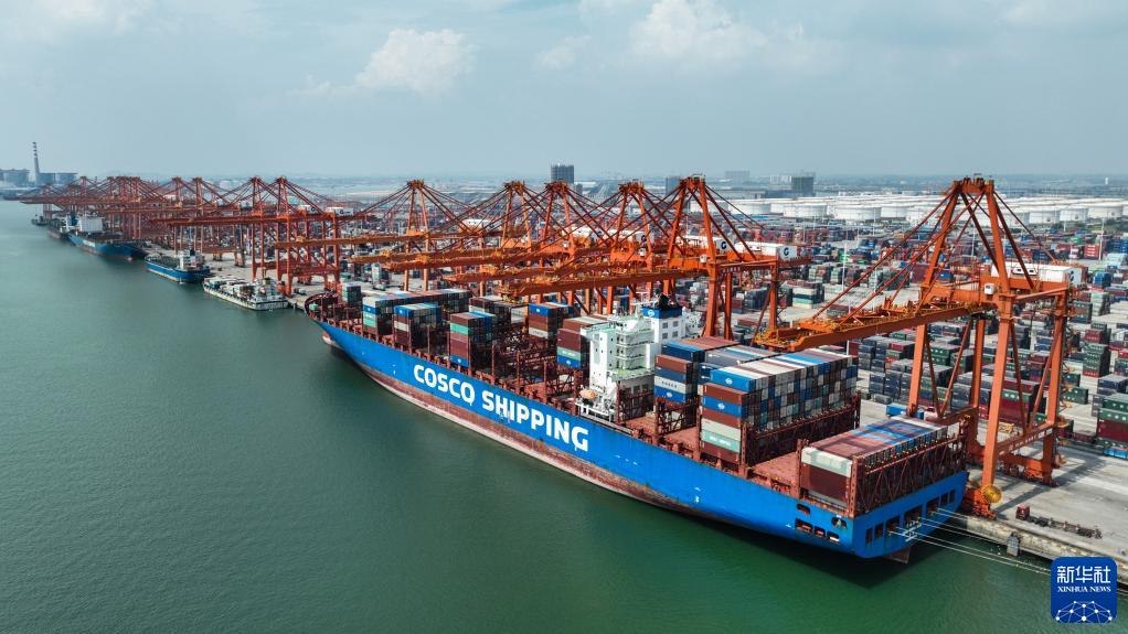 多艘海輪停泊在欽州港集裝箱碼頭裝卸貨物(2022年9月13日攝,無人機照片)。新華社記者 張愛林 攝