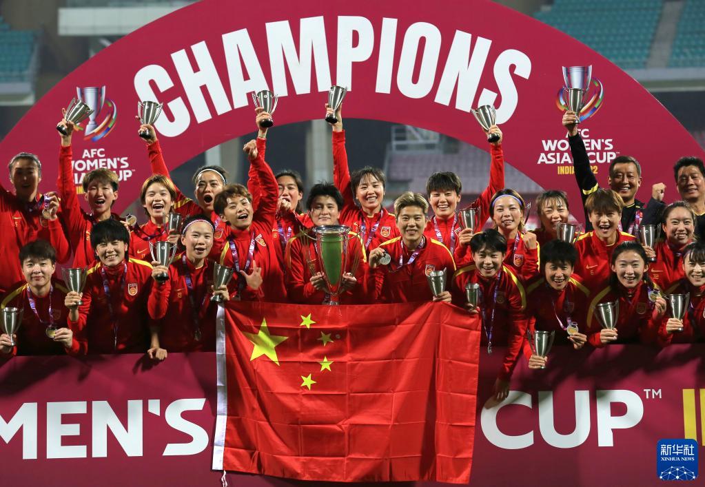 這是2022年2月6日,中國隊在2022女足亞洲杯頒獎儀式上慶祝。新華社發(賈韋德·達爾 攝)