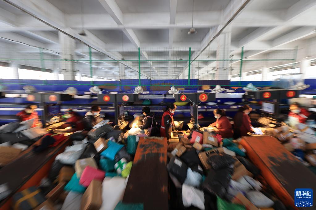 在浙江省湖州市吳興區八里店鎮一家物流企業,工作人員分揀快遞(2022年12月12日攝)。新華社發(何偉衛攝)