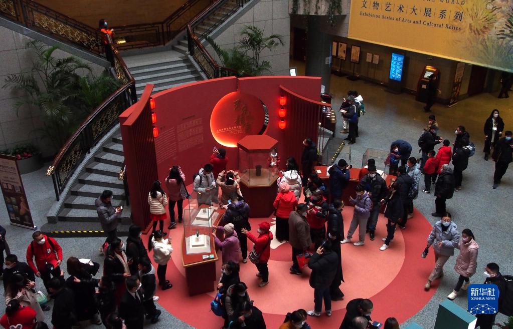 1月22日,觀眾在上海博物館大堂里觀看兔年迎春展。新華社記者 任瓏 攝