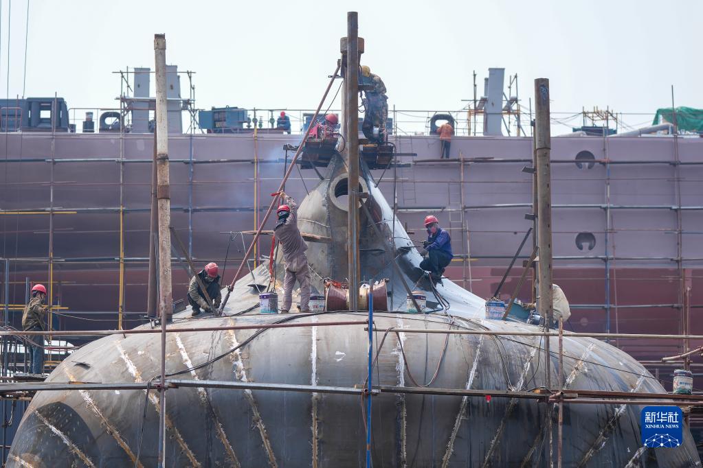 工程技術(shù)人員在位于山東省威海市的黃海造船有限公司廠區(qū)建造船舶(2022年5月20日攝)。新華社記者 朱崢 攝