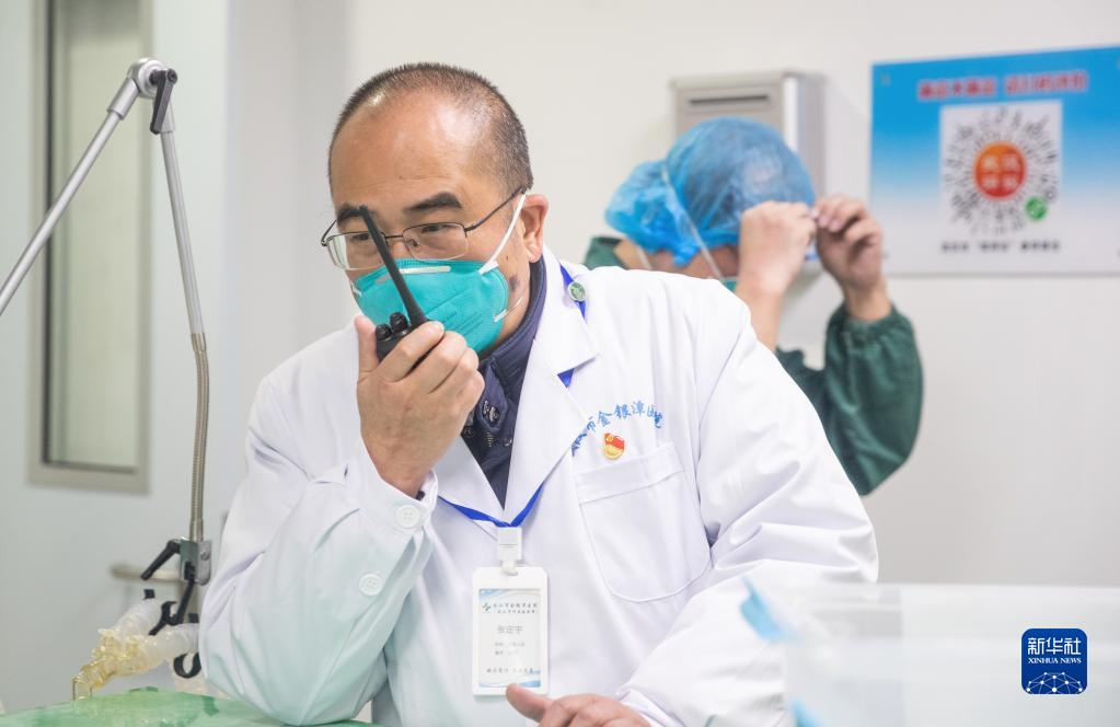 2020年1月27日,時任武漢金銀潭醫(yī)院院長的張定宇在醫(yī)院綜合病區(qū)樓聯(lián)系、協(xié)調(diào)工作。新華社發(fā)(柯皓 攝)