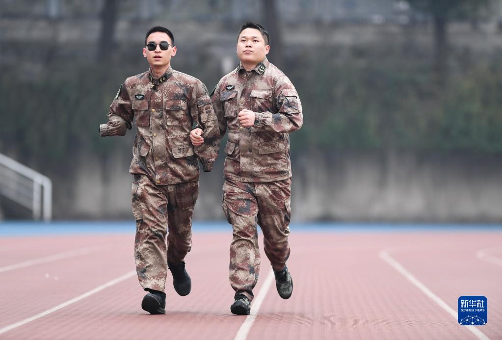 2020年1月2日,“排雷英雄戰(zhàn)士”杜富國(左)和戰(zhàn)友在陸軍軍醫(yī)大學操場上跑步。新華社記者 王全超 攝