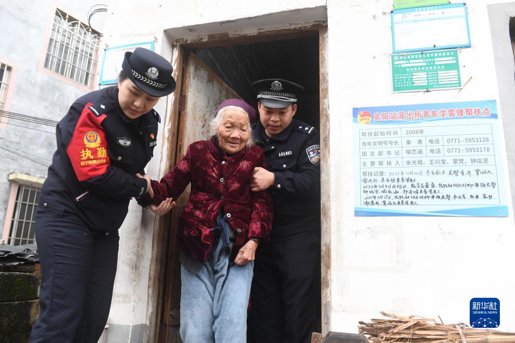 2023年2月5日,在廣西賓陽縣黎塘鎮(zhèn)梁村,賓陽站派出所民警扶著黃愛明老人走出家門。92歲的黃愛明老人是當?shù)匾幻灞衾先恕J嗄陙恚糠曛苣┖凸?jié)假日,派出所青年民警志愿者會帶著一些生活用品去看望老人,陪她聊天,幫她做家務等。新華社記者 陸波岸 攝