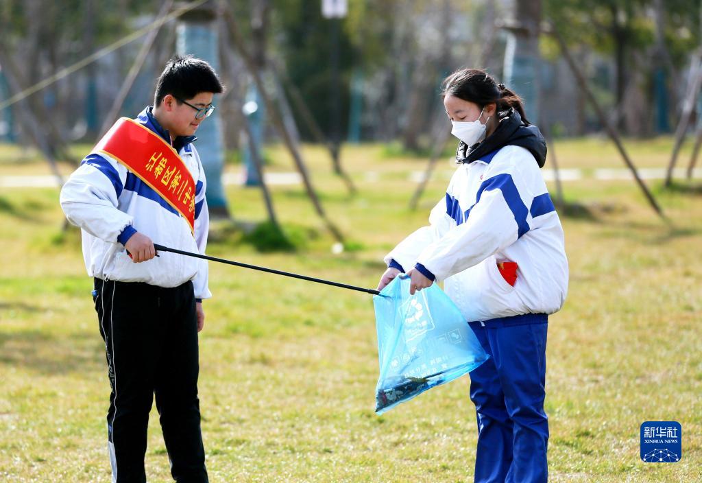 2022年3月5日,在江蘇省揚州市江都區(qū)雙擁公園,江都區(qū)第二中學學生在學雷鋒主題活動中撿拾垃圾。新華社發(fā)(任飛 攝)