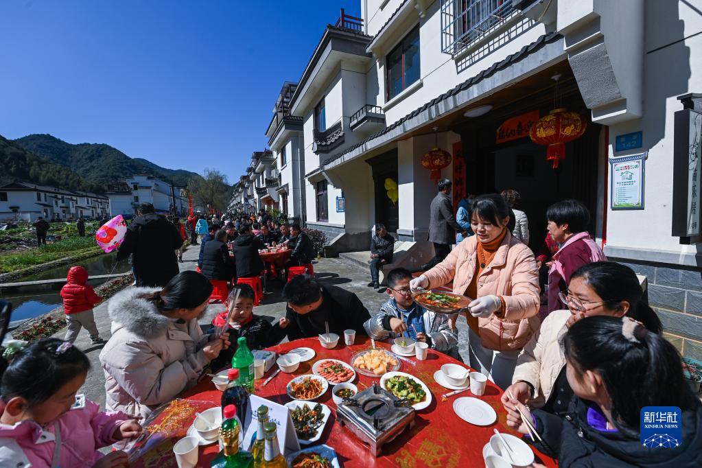 游客在浙江省建德市蓮花鎮戴家新村的百家宴上品嘗特色美食,感受新農村“舌尖上的幸福”(2023年2月26日攝)。新華社記者 徐昱 攝