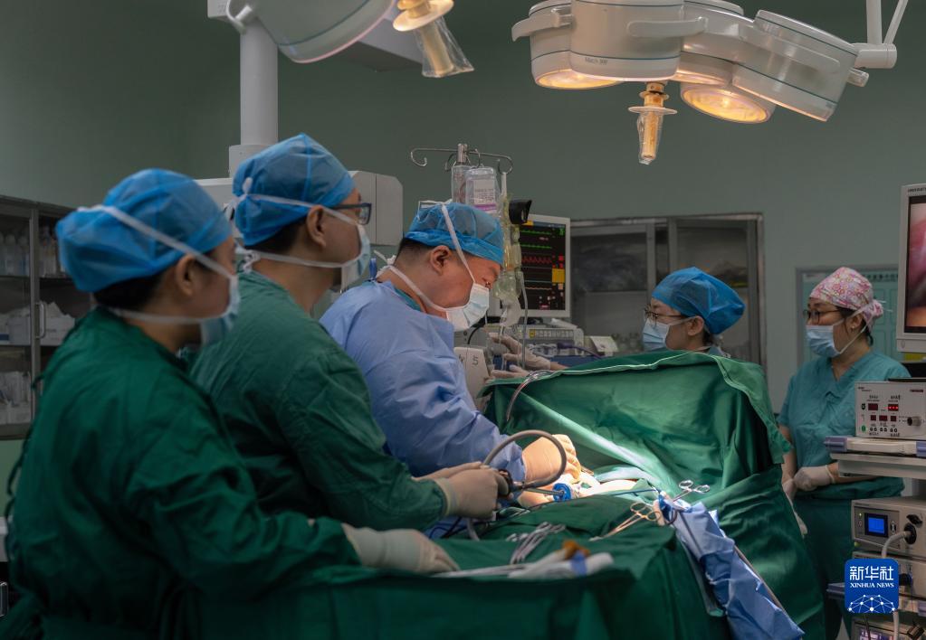 在北京市第六醫院的醫聯體胸外科病房手術室,北京協和醫院與北京市第六醫院的醫護人員進行團隊協作開展胸腔鏡手術(2021年6月3日攝)。新華社記者 才揚 攝